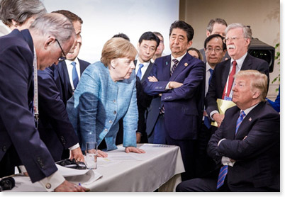 2018年,两张图在全世界一夜走红。一张是6月G7峰会上,美国总统特朗普抱胸而坐,满脸不屑,遭到其它各国领导人的围攻。