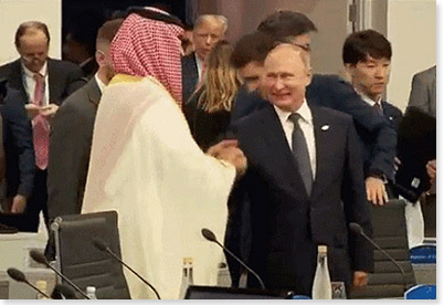 另一张则是11月G20峰会,俄罗斯总统普京和沙特王储萨勒曼像兄弟般击掌,而此时走入会场的特朗普脸上难掩落寞的神情。