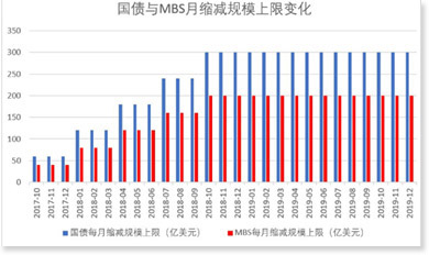 次贷危机爆发后,美联储推出大规模资产购买计划,导致美联储资产负债表总资产由危机前的约9000亿美元急剧扩张至约4.5万亿美元。2014年10月,美联储宣布退出量化宽松(QE)政策,停止新增资产购买计划,以实现增量部分的退出。2017年10月,美联储开始有计划地实施缩表,以逐步退出过去的存量部分。起初每个月额度为100亿美元,包括 60亿美元国债和40亿美元机构债和MBS,之后每三个月调整一次额度,到了2018年10月,缩表已经加码到每月500亿美元,对国债和MBS的每月减持上限分别达到300亿美元、200亿美元的最高值。